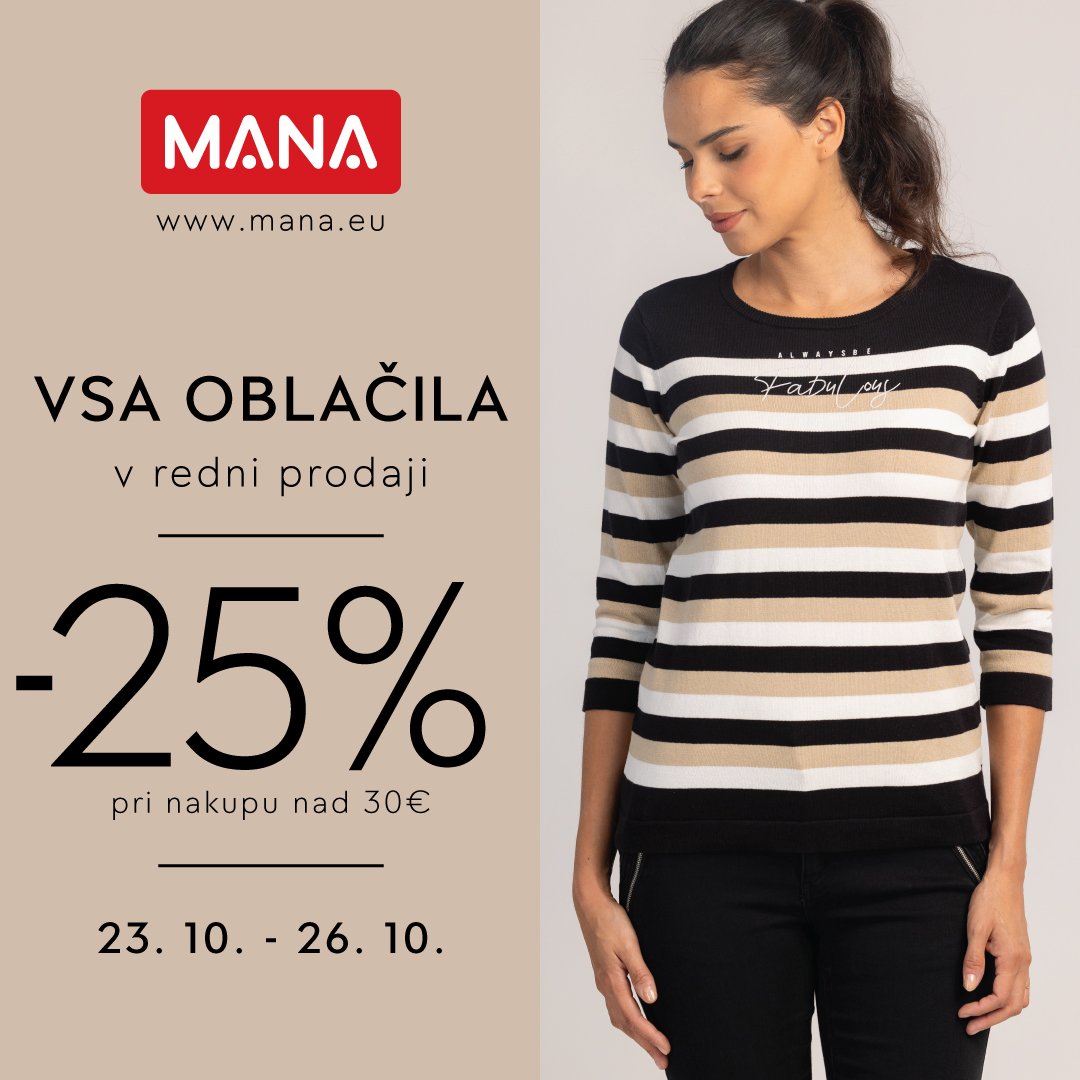 V trgovinah MANA in na spletu lahko sedaj prihraniš kar 25% pri nakupu nad 30 eur oblačil v redni prodaji!