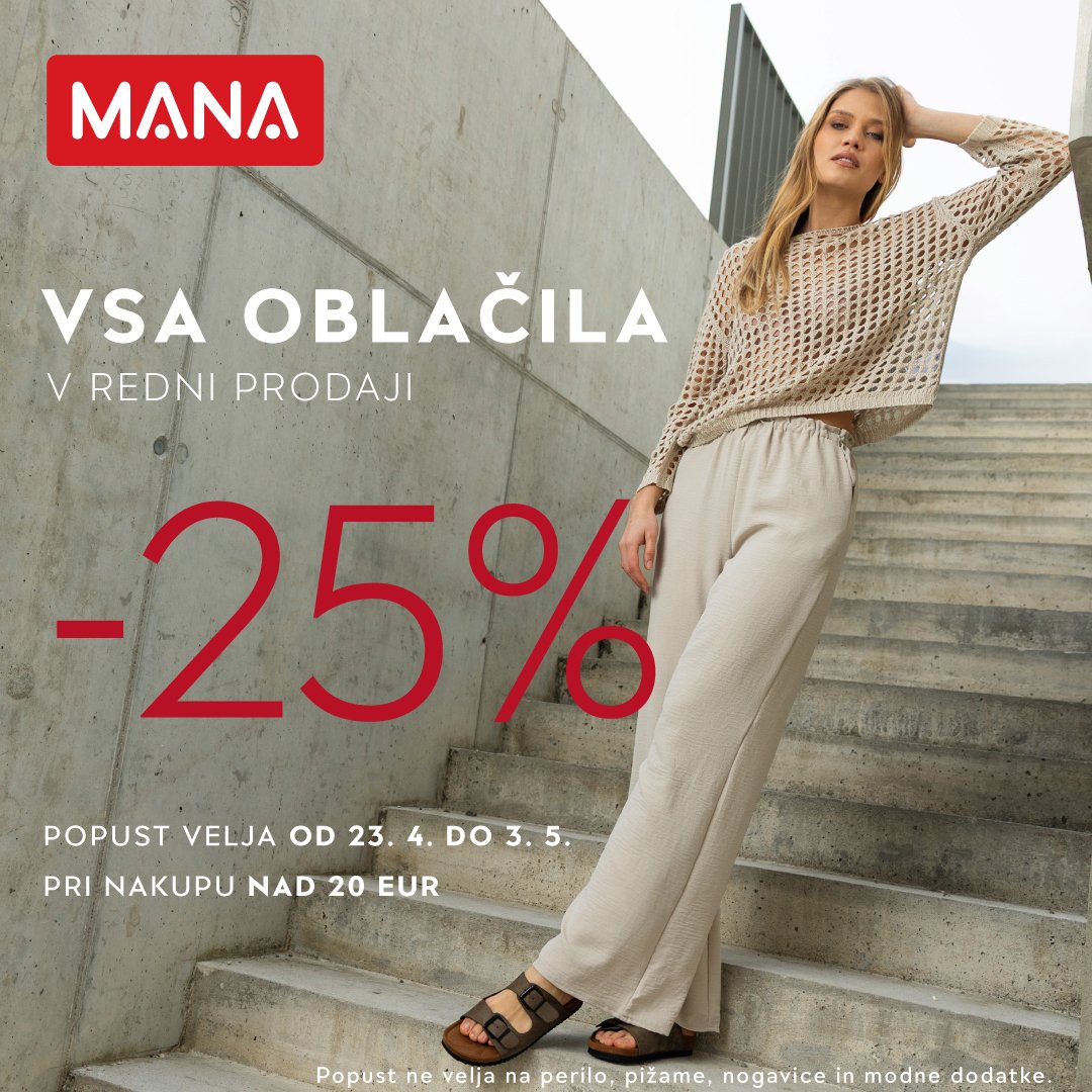 V trgovinah MANA te čaka izjemna akcija! Ob nakupu oblačil nad 20 EUR prejmeš 25% popust! Ne čakaj, pohiti in prihrani!