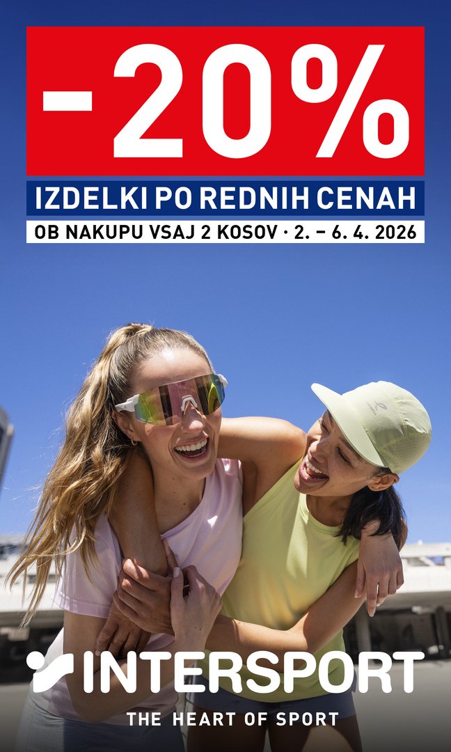 Zavijte v INTERSPORT in izkoristite 20 % popusta za oblačila, obutev in opremo po rednih cenah pri nakupu vsaj 2 kosov.